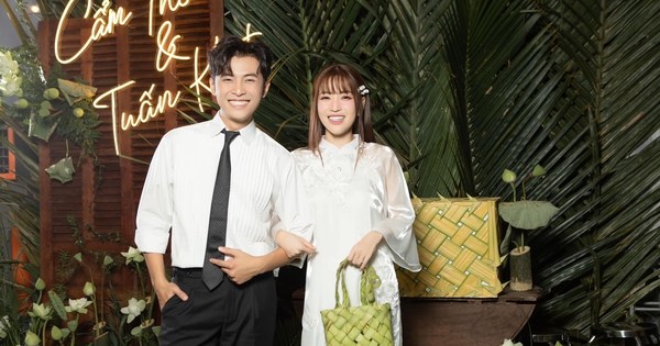 Cô dâu Puka diện áo dài trắng duyên dáng, trang điểm nhẹ nhàng và xách giỏ đan thắt bằng lá dừa. Chú rể mặc áo sơ mi trắng, quầy tây lịch sự.