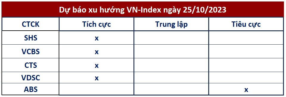 Theo quan điểm của Chứng khoán SHS, nỗ lực phục hồi phiên 24/10 đã giúp VN-Index lấy lại được mốc hỗ trợ 1.100 điểm và lại mở ra khả năng tạo đáy ngắn hạn và hình thành sóng hồi. Nếu chỉ số tiếp tục tăng điểm trong các phiên tới thì có thể hình thành mô hình đáy W hoặc ít nhất là tạo đáy ngắn hạn và hướng tới điểm cân bằng cao hơn. Tuy nhiên sự phục hồi này nếu xảy ra cũng chỉ mang tính kỹ thuật bởi xu hướng Uptrend đã kết thúc và rủi ro chỉ số điều chỉnh trở lại và kiểm định các vùng giá thấp hơn vẫn duy trì.